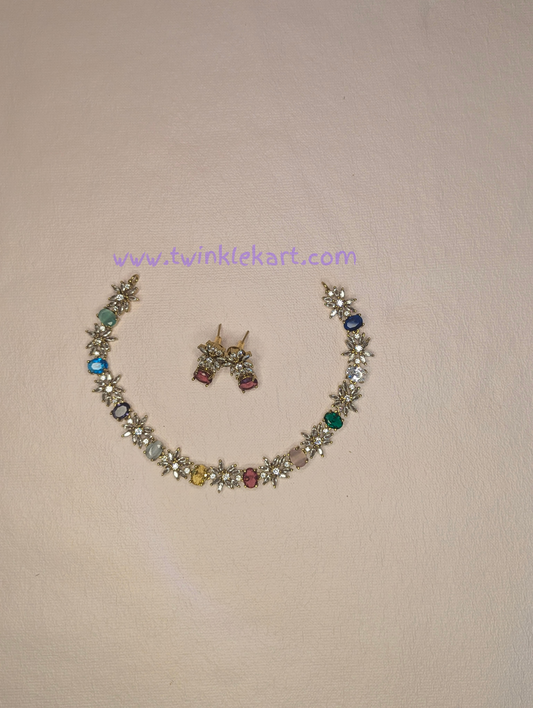 Premium Rainbow Gemstone Flower Necklace Set With Earrings