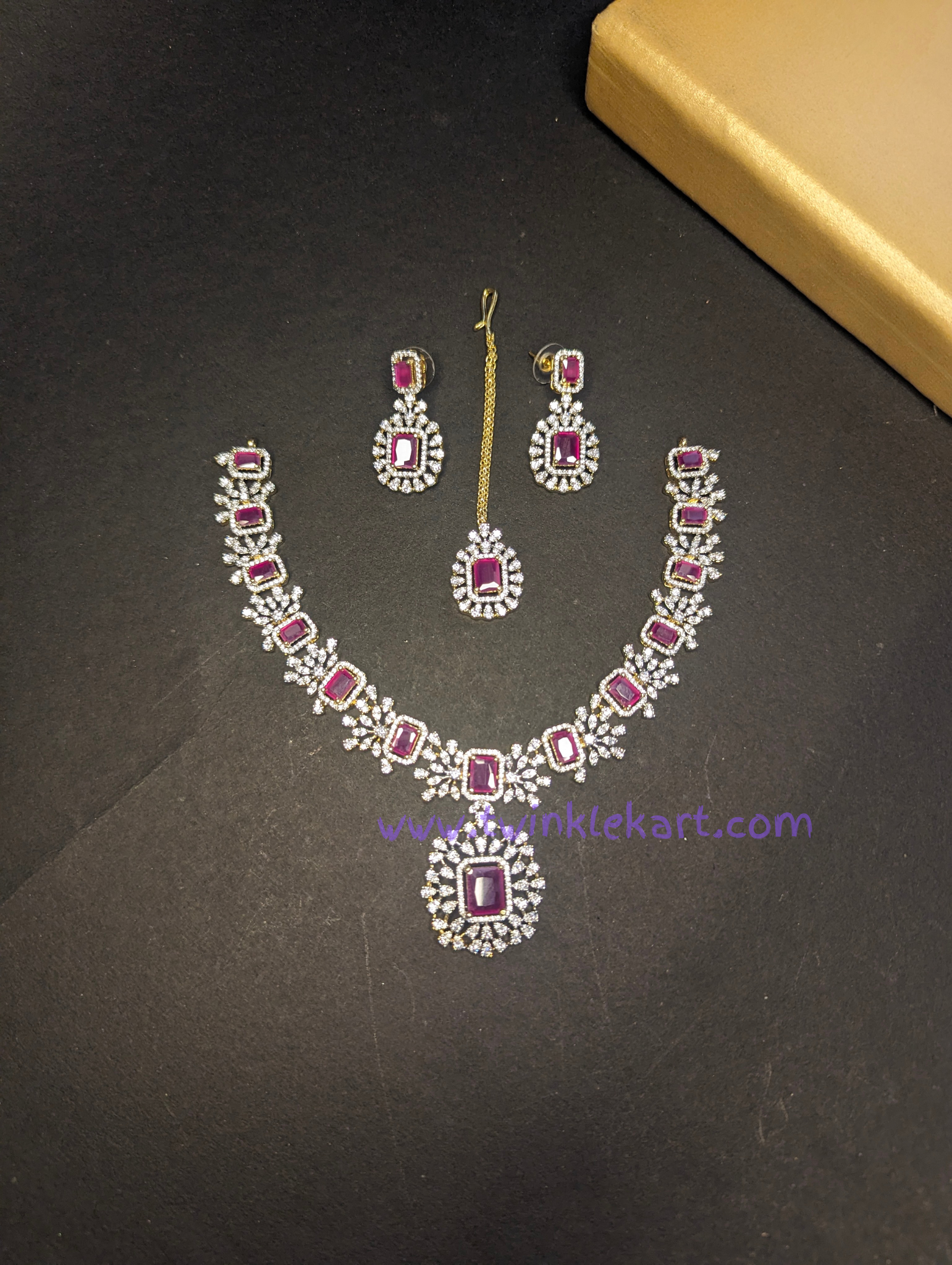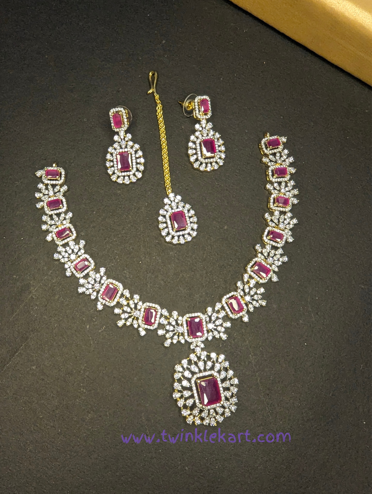 Discover the captivating beauty of our Sapphire Pink Stone Dazzling Diamond Set with Tikka and Earrings. This exquisite piece features vibrant sapphire pink stones, complemented by the sparkling brilliance of American Diamonds (AD). The set includes a stunning necklace, matching earrings, and a delicate tikka for a complete and elegant look.